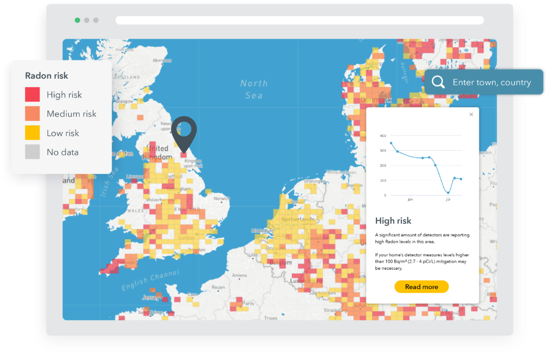 Radonmap.com utilizar sensores de Airthings de todo el mundo para mostrar los niveles de radón, clasificados por ubicación y anonimizados. Vea los cálculos aproximados de riesgo anuales y mensuales en este mapa interactivo fácil de usar. Su vecino puede tener niveles de radón diferentes a los suyos, por lo que es importante controlar su propia casa.